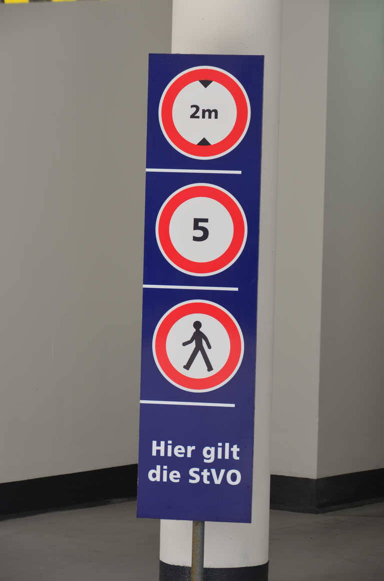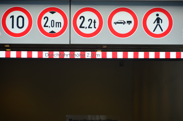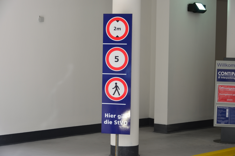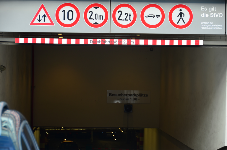 Einfahrt in ein Parkhaus mit oberhalb angebrachten Verkehrszeichen