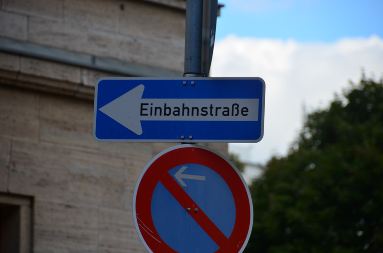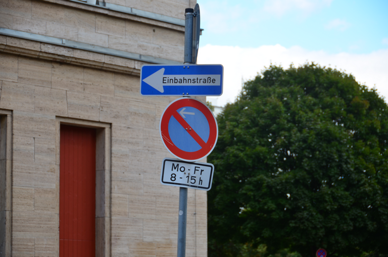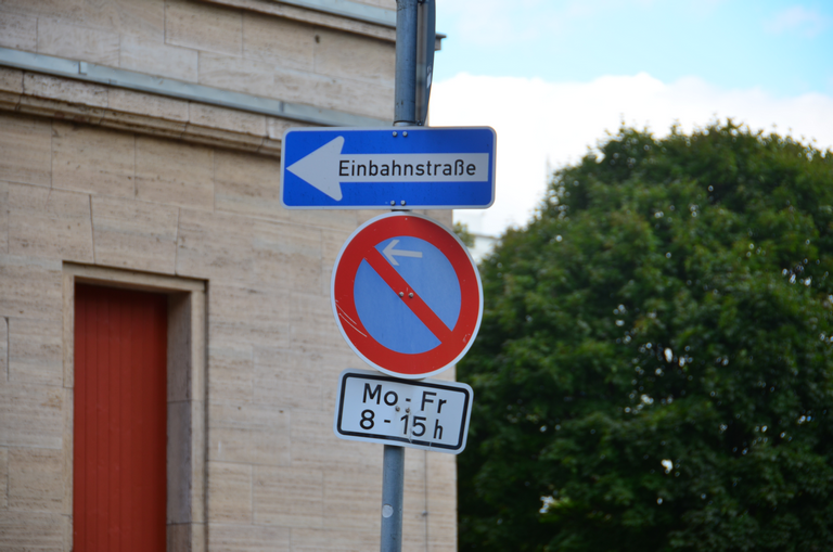 Schilder Einbahnstraße und eingeschränktes Halteverbot