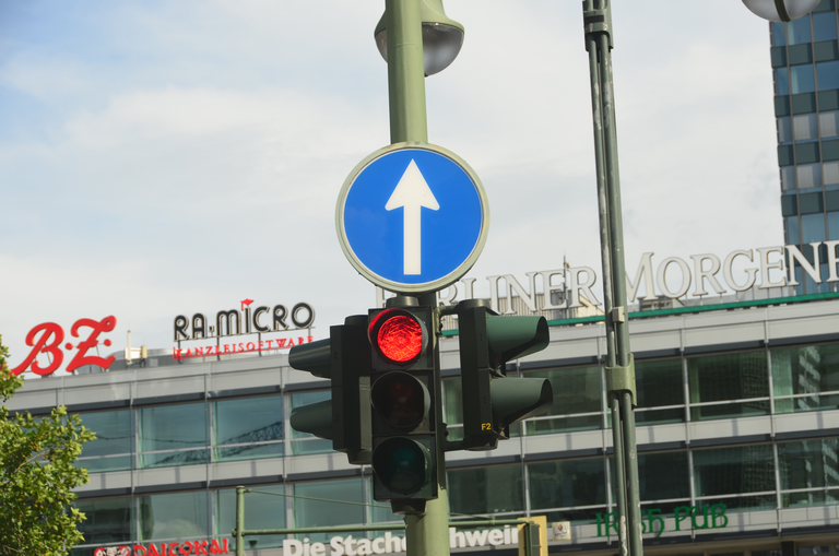 Zeichen vorgeschriebene Fahrtrichtung - geradeaus an Ampelmast